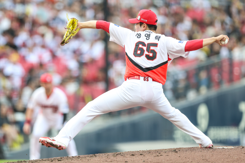 대기록으로 향하는 과정이 완벽에 가까웠다. 5-0으로 앞선 8회 초 마운드를 밟은 성영탁은 리그에서 가장 뜨거운 타자 안현민을 2구 만에 중견수 플라이로 잡아냈다. 초구 스트라이크로 유리한 볼카운트를 선점한 뒤 커브로 타격 타이밍을 빼앗았다. 이어 이정훈과 멜 로하스 주니어를 연속 범타로 처리, 가뿐하게 아웃카운트 3개를 잡아냈다. 9회에도 교체 없이 등판한 성영탁은 장성우(헛스윙 삼진) 허경민(투수 땅볼) 문상철(2루 땅볼)을 공 10개로 처리했다. 하나 같이 노련한 베테랑 타자인데 흔들림이 없었다. 투구 수 19개 중 15개(79%)가 스트라이크. 공격적인 피칭으로 KT 타자를 압도했다.