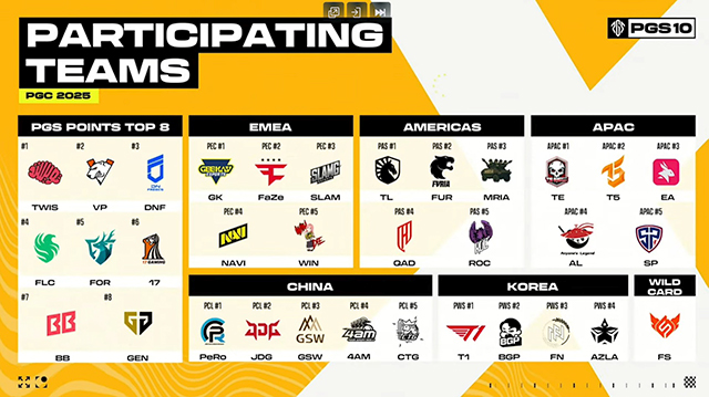 다가오는 PGC 2025에서는 팬들의 기대를 모은 ‘한·중·유럽 더비’가 성사될 전망이다. 한국의 젠지 e스포츠(Gen.G Esports), 디엔 프릭스(DNF), 티원(T1), 배고파(BGP), FN 포천(FN POCHEON), 아즈라 펜타그램(AZLA) 등이 중국의 17 게이밍(17 Gaming), 포 앵그리 맨(4AM), 유럽의 트위스티드 마인즈(Twisted Minds), 버투스 프로(Virtus.pro) 등 글로벌 강호들과 맞붙는다. 이 밖에도 팀 팔콘스(Team Falcons), 페이즈 클랜(FaZe Clan), 팀 리퀴드(Team Liquid) 등 각 지역을 대표하는 명문팀이 참가 명단에 이름을 올리며, PGC 2025는 지역 간 자존심이 걸린 ‘글로벌 올스타 더비’로 기대를 모으고 있다.
