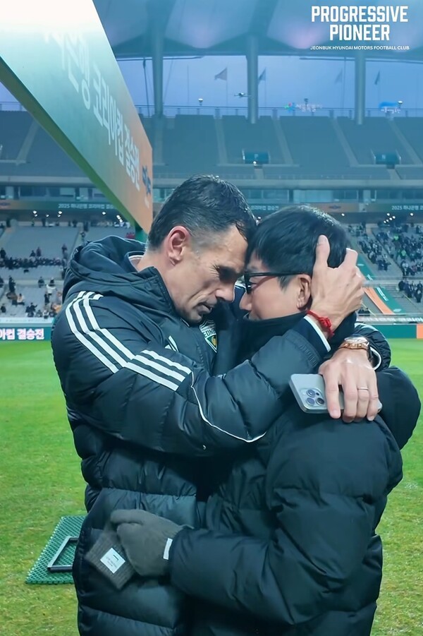 광주 일동은 시상식 전 비교적 밝은 얼굴로 팬들과 축하해 주기 위해 모인 전북 선수단 앞에 섰다. 이정효 감독, 마철준 수석 코치 등이 파이팅을 불어넣으며 전북 일동과 축하를 주고받았다. 하이라이트는 이정효 감독과 포옛 감독의 만남이었다. 평소 여러 차례 리스펙트를 주고받은 바 있는 두 사람은 이번엔 긴 시간 포옹하며 훈훈한 분위기를 조성했다.