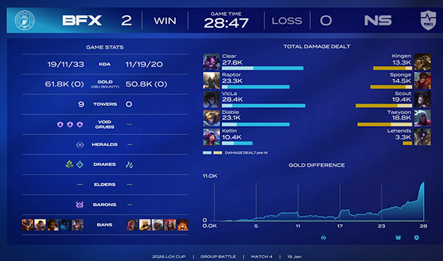 중반 과하게 진입한 BNK를 농심이 막아내며 상대의 흐름을 끊나 했지만 격차는 줄지 않았고, 바론을 사냥한 BNK는 빅라의 활약으로 후속 교전까지 승리하고 승기를 잡았다.