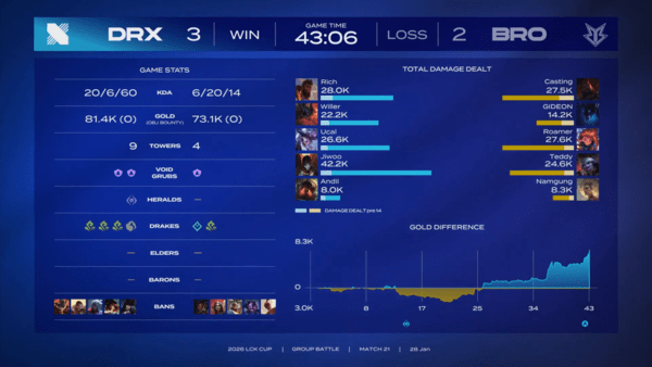 이번 승리로 DRX는 2승 3패를 기록하며 장로 그룹에 귀중한 승점 2점을 보탰다.