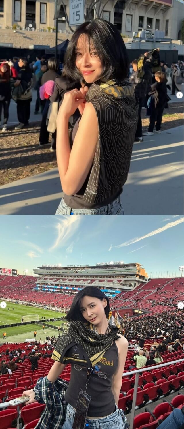 공개된 사진 속 권나라는 지난 22일(한국 시각) LA 메모리얼 콜리세움에서 개최된 미국 메이저리그사커(MLS) 2026 시즌 정규리그 개막전 현장을 방문한 모습이다.