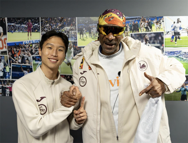 스완지시티에서 뛰는 국가대표 공격수 엄지성이 '힙합 대부' 스눕독과 스웩 가득한 투샷을 공개했다.